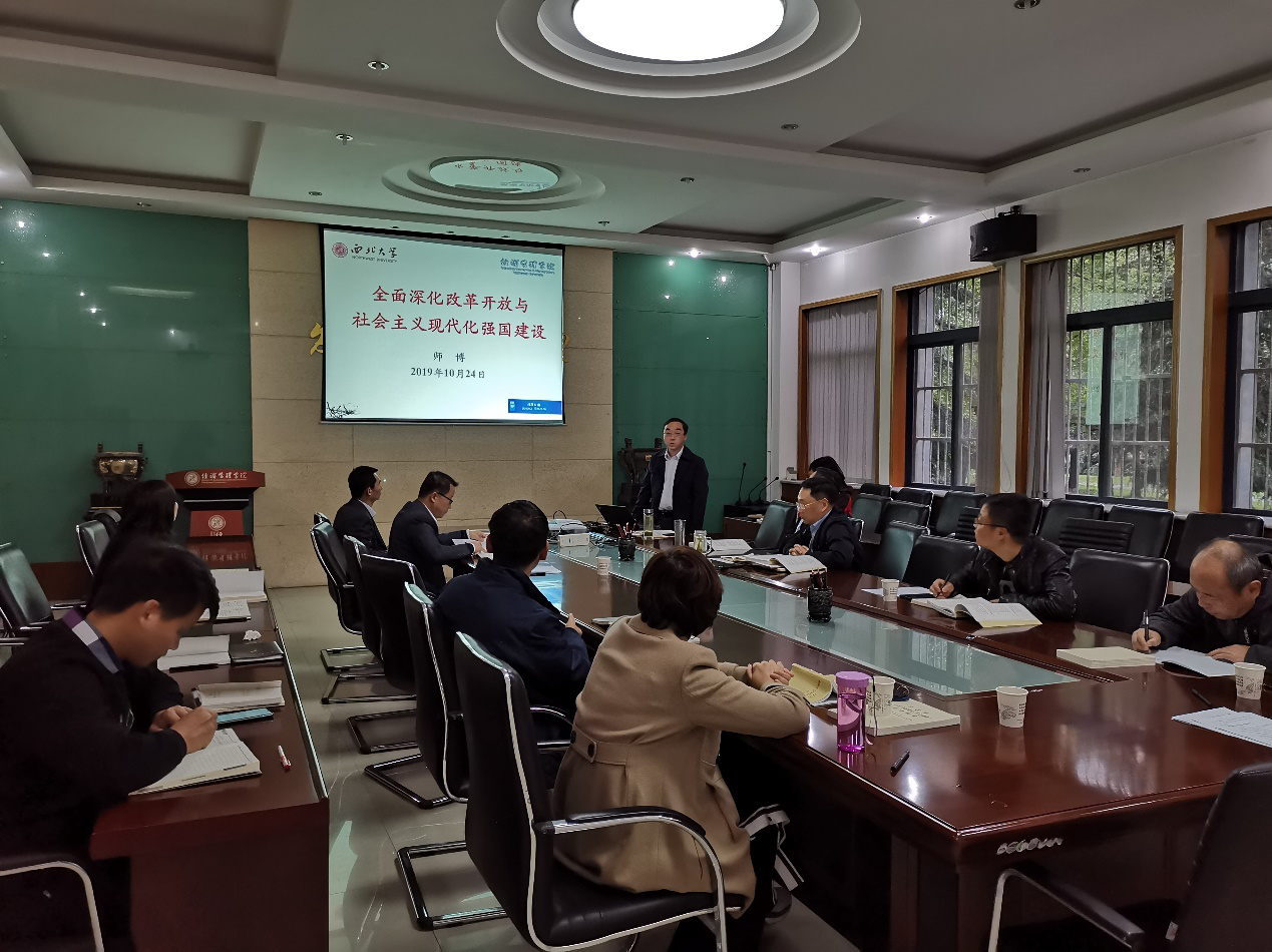 为深入学习习近平新时代中国特色社会主义思想,充分了解新时代坚持和发展中国特色社会主义的理论和实践,坚持贯彻将全面深化改革进行到底的战略定力,10月24日,副院长师博教授在学院一楼会议室做了题为《全面深化改革开放与社会主义现代化强国》的专题讲座,学院党委中心组及全体党支部书记参加了本次讲座,讲座由学院党委书记杜勇主持。