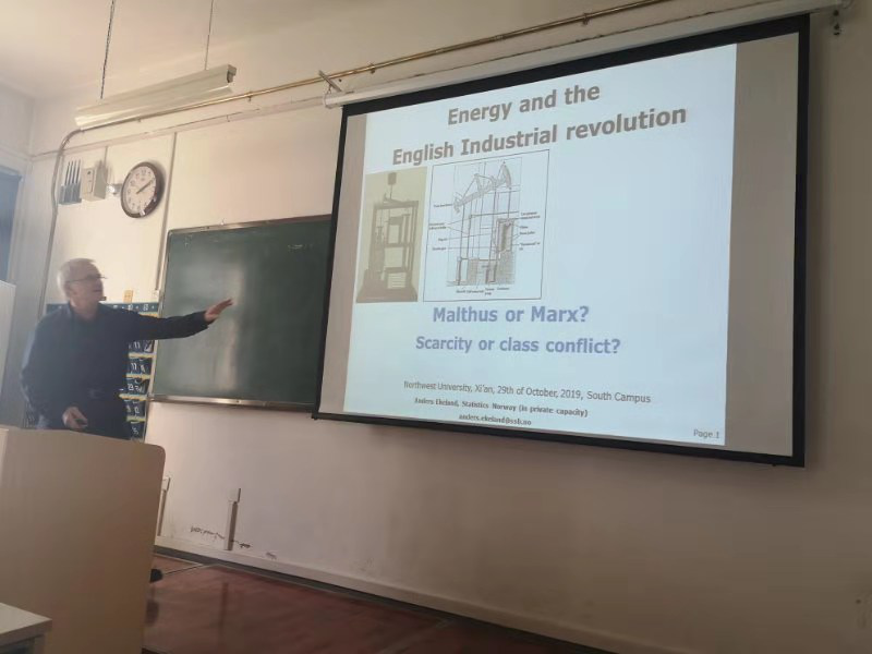 2019年10月29日,挪威国家统计局高级经济师安德森·艾克兰应邀为yl23455永利官网2017级经济学(基地班)及2017级数理经济学实验班学生作题为《能源和英国工业革命》的学术报告,报告在2308教室举行,由岳利萍教授主持。在报告中,艾克兰教授以能源的革新为切入点研究第一次英国工业革命,对马尔萨斯和马克思关于工业革命成因的争论展开论述,并从能源的稀缺性和社会阶级矛盾冲突两个角度进行了解释和分析。