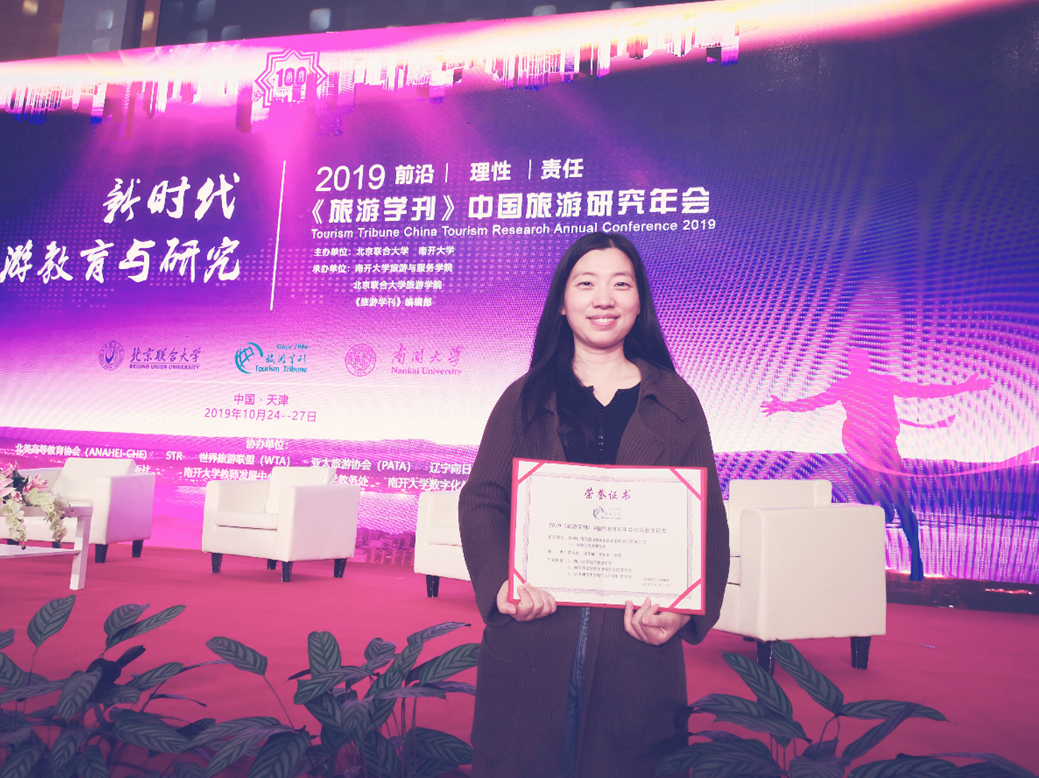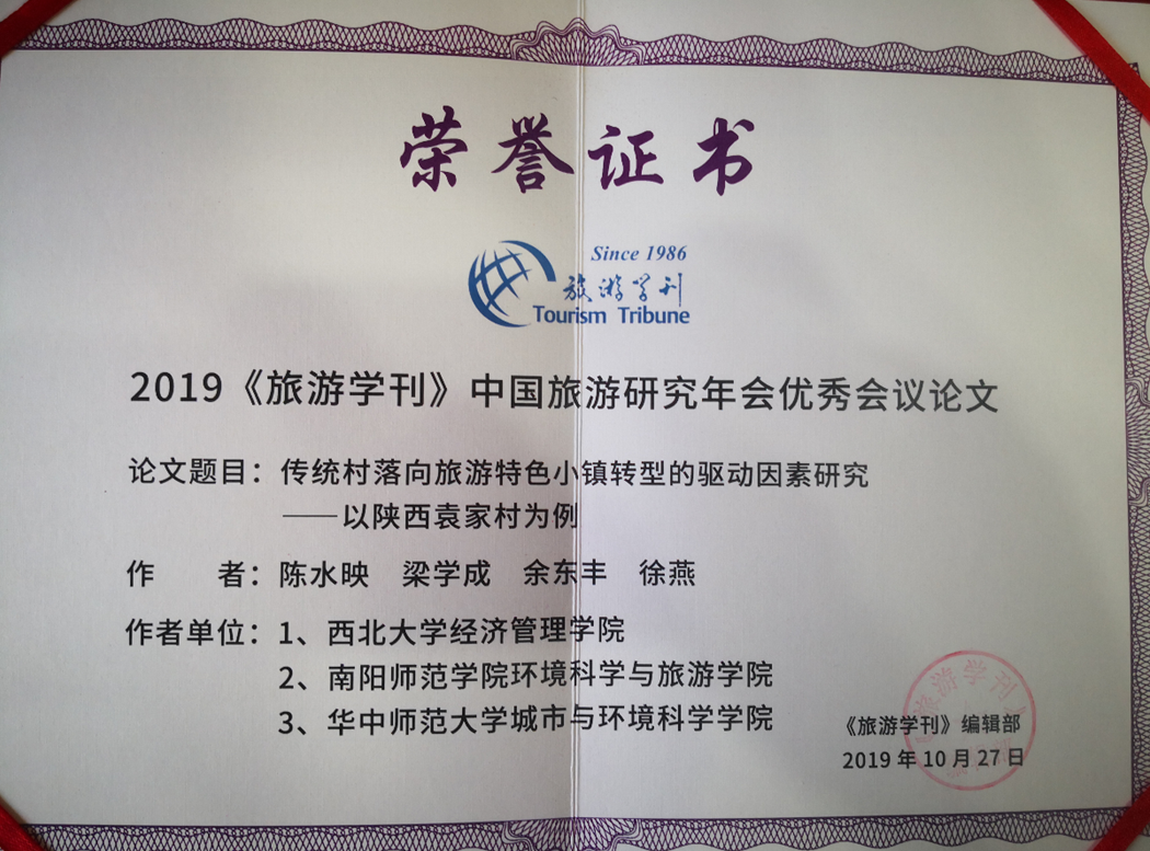 10月26日-27日,由北京联合大学、南开大学主办的“2019《旅游学刊》中国旅游研究年会”在天津南开大学隆重举行。在本次会议上,永利官网博士生陈水映和导师梁学成教授等共同完成的论文《传统村落向旅游特色小镇转型的驱动因素研究——以陕西袁家村为例》荣获年会优秀论文奖;这也是继永利官网旅游管理系青年教师褚玉杰之后连续第二次获此荣誉。