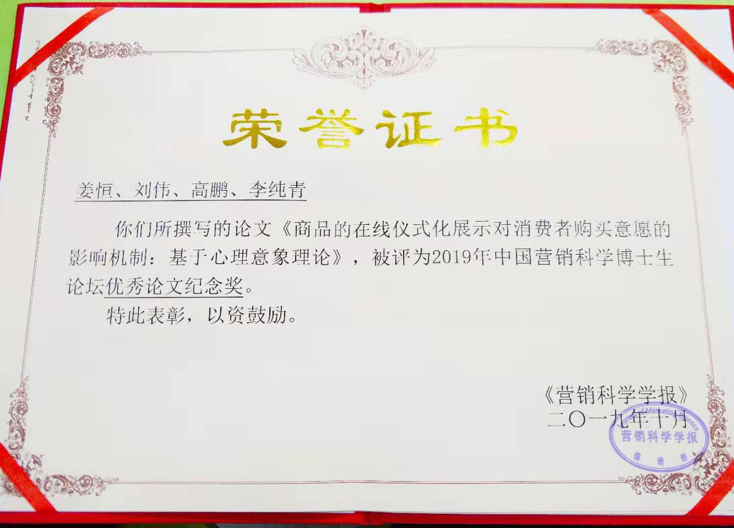 永利官网硕士研究生姜恒同学为第一作者的论文《商品的在线仪式化展示对消费者购买意愿的影响:基于心理意象加工理论》经过同行专家的多轮评审最终荣获博士生论坛优秀论文入围纪念奖(综合排名第九)。该论文是在刘伟副教授的精心指导下完成的,也吸收了高鹏副教授和李纯青教授的修改意见,是永利官网市场营销研究团队建设的一个重要成果。