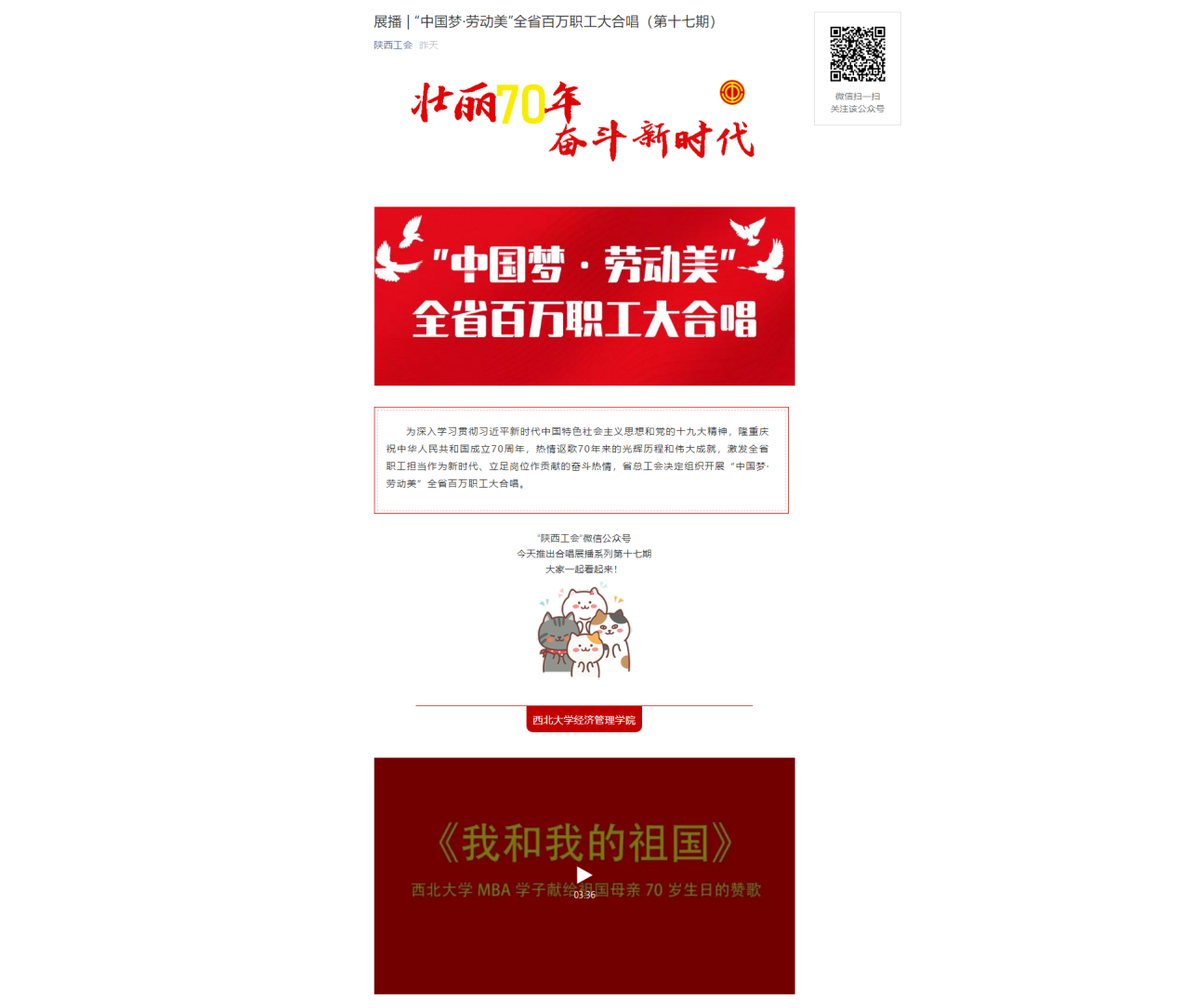 金秋气爽,丹桂飘香。2019年9月21日永利官网MBA学员唱响《我和我的祖国》,致敬我们伟大的祖国,献礼祖国70华诞。视频在陕西省总工会举办的“中国梦﹒劳动美”百万职工大合唱活动中展播,并在优酷、网易、今日头条等多家媒体网站收录。