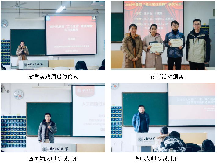 1月15日,首先由马莉莉老师介绍本次实践活动基本构想;而后王颂吉老师主持国贸系读书活动颁奖仪式,并布置寒假读书工作。随后第一场专题讲座是由yl23455永利官网信息科学与技术学院的章勇勤老师主讲“人工智能进展及其应用背景”,内容包括当前人工智能的发展现状、应用领域及未来的发展趋势。下午第二场专题讲座由yl23455永利官网中东研究所李玮老师主讲“泛安全化时期的国际关系和中国新青年面临的机遇和挑战”,内容包括“世界与梦想”、“2018年来‘一带一路’建设的重点和难点”,以及新时代下的新青年所面临的机遇和挑战。通过李老师生动有趣的讲解,同学们对当前的全球形势、特别是中美关系有了进一步的认识。晚上第三场专题讲座由华夏幸福基业的靳毅先生主讲“开发区和园区经济模式分析”,他首先介绍了开发区的类型、牌子赋能,其次介绍了企业的规模与类型、公共技术平台、陕西航空综合保税区,最后介绍了华夏幸福集团的运营模式。聆听完讲座,同学们认识到,陕西作为一个拥有众多科技园区的省份,需要充分挖掘优势,应对挑战,并且和“一带一路”相结合,以促进地方经济发展。