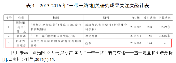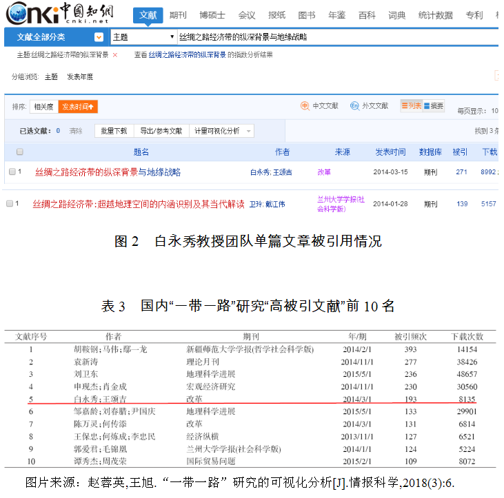 2.单篇论文被引用频次在“一带一路”研究领域位列前茅。白永秀教授团队发表在《改革》2014年第3期的论文《丝绸之路经济带的纵深背景与地缘战略》,是国内学术界第一批系统研究丝绸之路经济带的文献之一。文章发表之后,被《新华文摘》2014年第12期转载,同时被人大复印报刊资料《国际经济文摘》2014年第3期转载,获陕西高校人文社会科学研究优秀成果二等奖、《改革》服务中央决策优秀论文奖等学术荣誉。截至目前,这篇论文被引用次数达到271次(中国知网,2018年9月18日数据),在“一带一路”研究领域位居前列。此外,卫玲编审等人发表在《兰州大学学报》2014年第1期的论文《丝绸之路经济带:超越地理空间的内涵识别及其当代解读》,被引用次数达到139次。