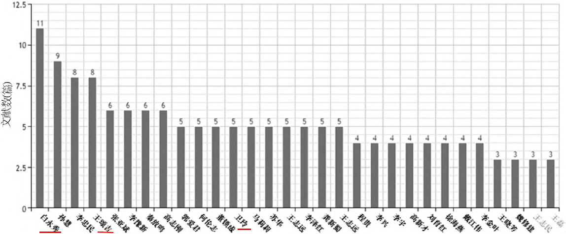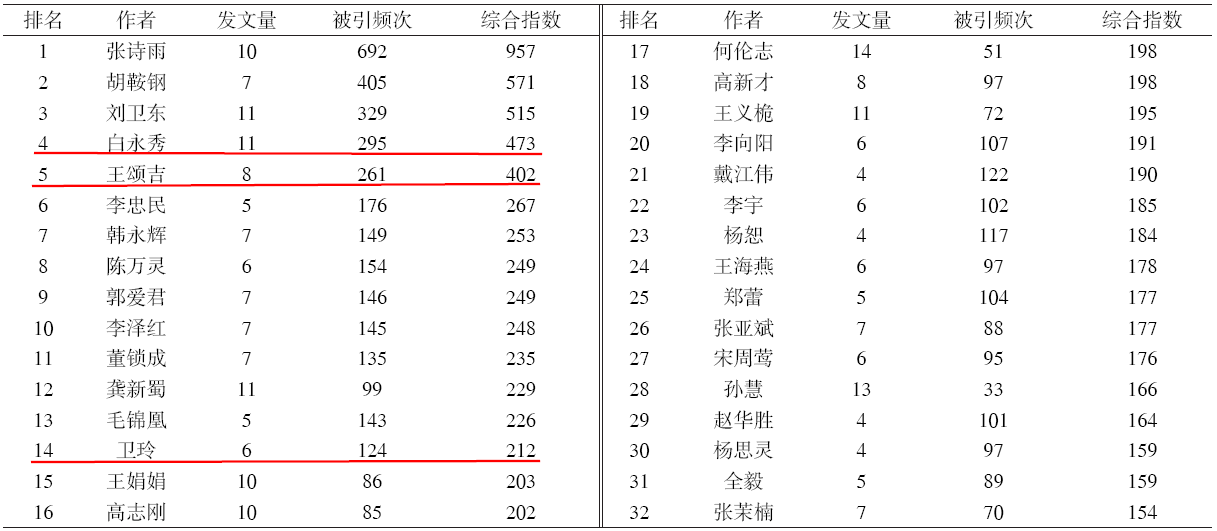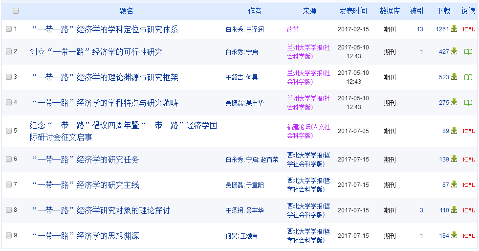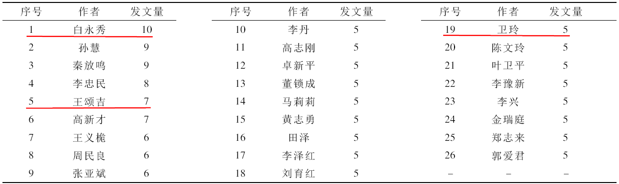 1.研究团队多位专家的论文发表数量位居全国前列。依据学术界统计(刘光阳等,2017;陈润羊等,2018;赵蓉英等,2018),白永秀教授领衔的“一带一路”研究团队中,白永秀教授的“一带一路”相关论文发表数量位居全国首位,卫玲编审、王颂吉副教授等多位专家的论文发表数量位居全国前列。