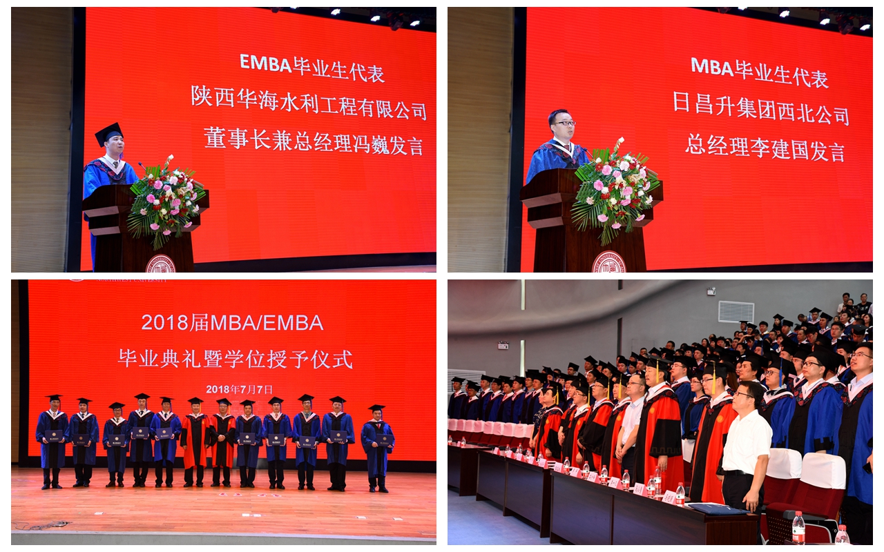 教师代表高煜教授也为毕业生送上了临别祝福,希望大家在MBA/EMBA这个熔炉中重塑后,未来更加美好、精彩。与此同时,也能承担起更多的社会责任,蓄积自己的力量,为国家发展做出更多贡献。MBA学员代表日昌升集团总经理李建国、EMBA学员代表陕西华海水利工程有限公司董事长兼总经理冯巍分别代表MBA、EMBA毕业生发表了感言,回顾了在校期间的美好记忆,也为毕业生、学院和母校送上了美好祝福。