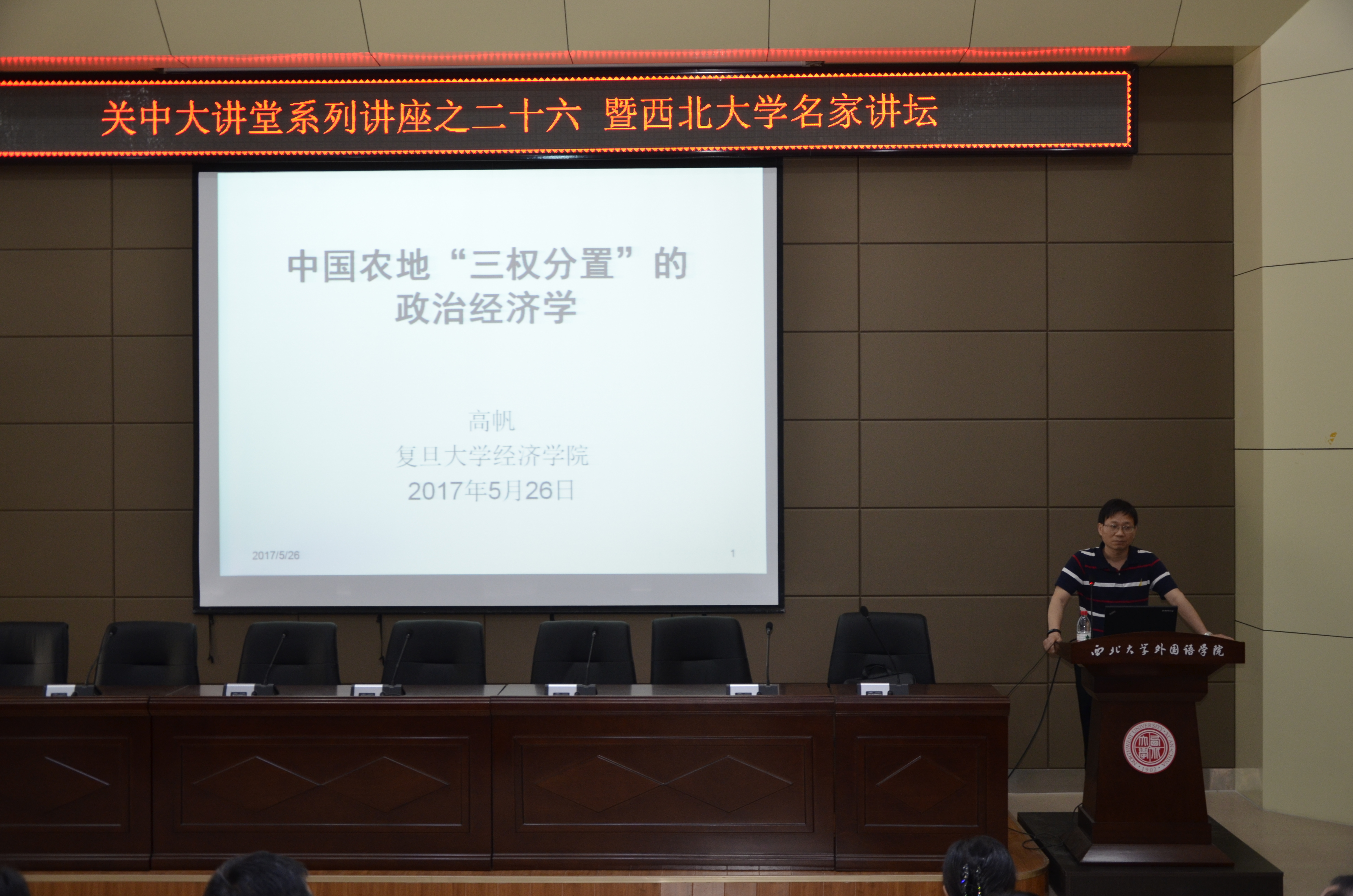 2017年5月26日,复旦大学经济学院经济学系常务副主任、博士生导师高帆教授访问永利官网,并在“关中大讲堂”系列讲座作题为《中国农地“三权分置”的政治经济学》的学术报告。此次活动也是yl23455永利官网名家讲坛系列活动之一。