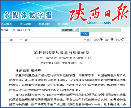 接到任务后,任保平教授并带领团队成员细致梳理和剖析陕西省以及相关省份的经济演进趋势和特征,将研究主题定为“从数量追赶向质量追赶的转型”。该团队的研究表明:陕西已经进入了以“数量追赶期、质量超越期、发展模式创新期”的“三期叠加”为特征的发展阶段,需要“以动力转换求质量超越,以质量超越促数量追赶”,使陕西经济从资源依赖型走向创新型,从汗水型走向智慧型,实现我省经济持续、健康和稳定的发展。在此基础上,课题组系统地提出了陕西省实现追赶超越的实施方案。
