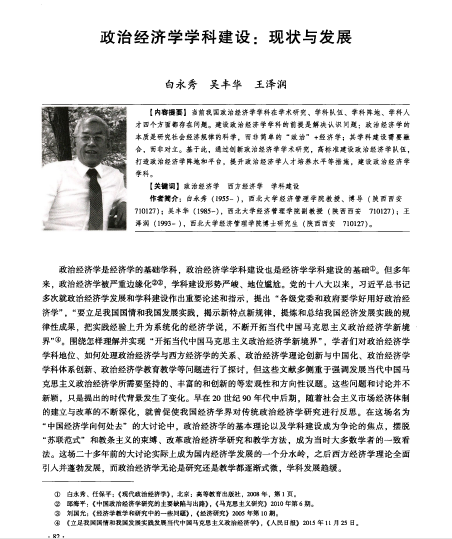 近日,永利官网白永秀教授、吴丰华副教授、王泽润博士生合作的论文《政治经济学学科建设:现状与发展》在权威刊物《马克思主义研究》2016年第8期发表,全文共1.5万字。
