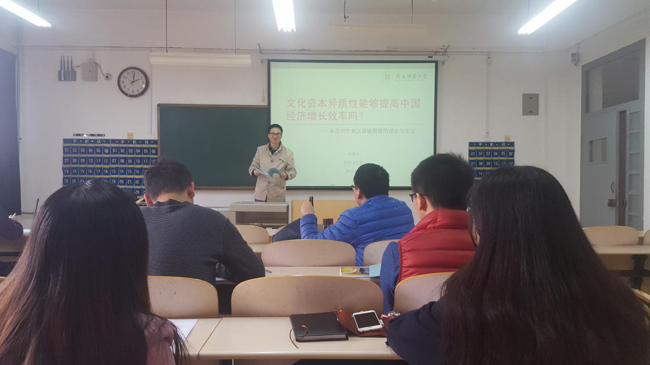 2016年11月9日下午,yl23455永利官网现代经济学理论与方法创新论坛第十二卷第六期在长安校区2号楼2310教室成功举行。陕西师范大学国际商学院的李娟伟老师对题为《文化资本异质性能够提高中国经济增长效率吗?——来自30个省区面板数据的理论与实证》的学术论文进行了汇报。报告由会计学系李辉老师主持,博硕士和本科生二十余人参加了本次讨论。