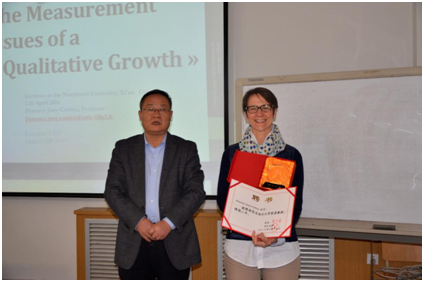 4月6日,法国里尔第一大学的Florence Jany-Catrice教授应永利官网邀请来永利官网开展系列学术交流活动,在永利官网长安校区8202教室做了第一次讲座,题为《History of GDP,Internal and External critics”(GDP的历史,内部与外部批判)》。在讲座开始之前,院长任保平教授向Florence Jany-Catrice教授颁发了永利官网兼职教授聘书和纪念牌。该次活动由副院长何爱平教授主持。