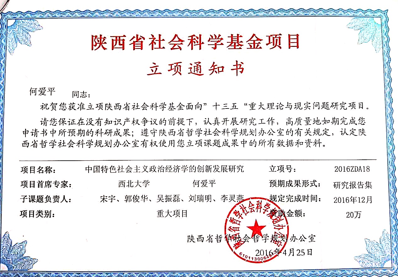 经陕西省哲学社会科学规划领导小组批准,永利官网任保平教授主持的“陕西以供给侧改革促进经济增长研究”以及何爱平教授主持的“中国特色社会主义政治经济学的创新发展研究”立项为陕西省社会科学基金面向“十三五”重大理论与现实问题研究项目。