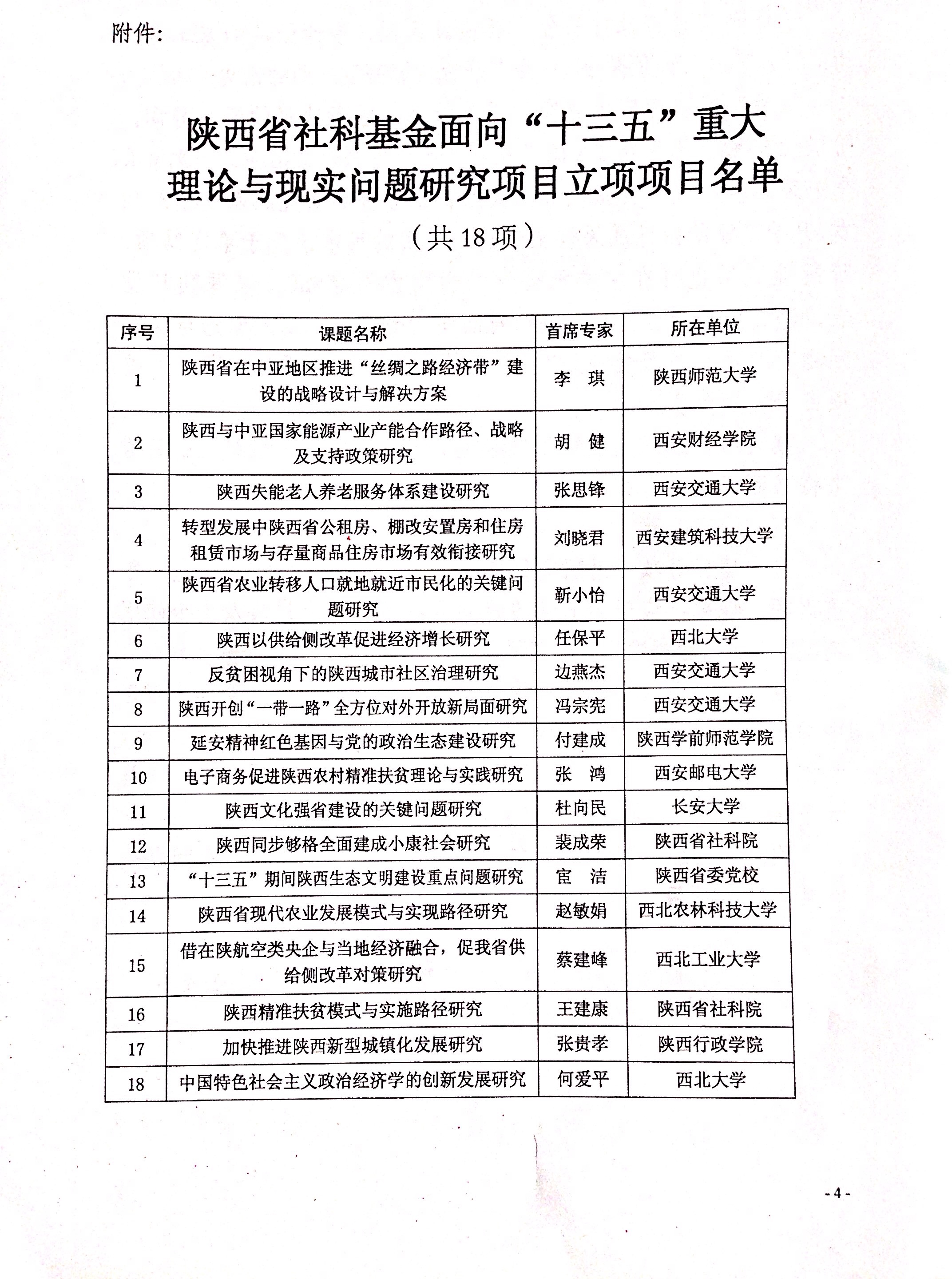 全省共有18项课题获陕西省社会科学基金面向“十三五”重大理论与现实问题研究项目立项。此次永利官网2项课题获批立项,标志着学院科学研究与服务社会的水平和能力进一步凸显。