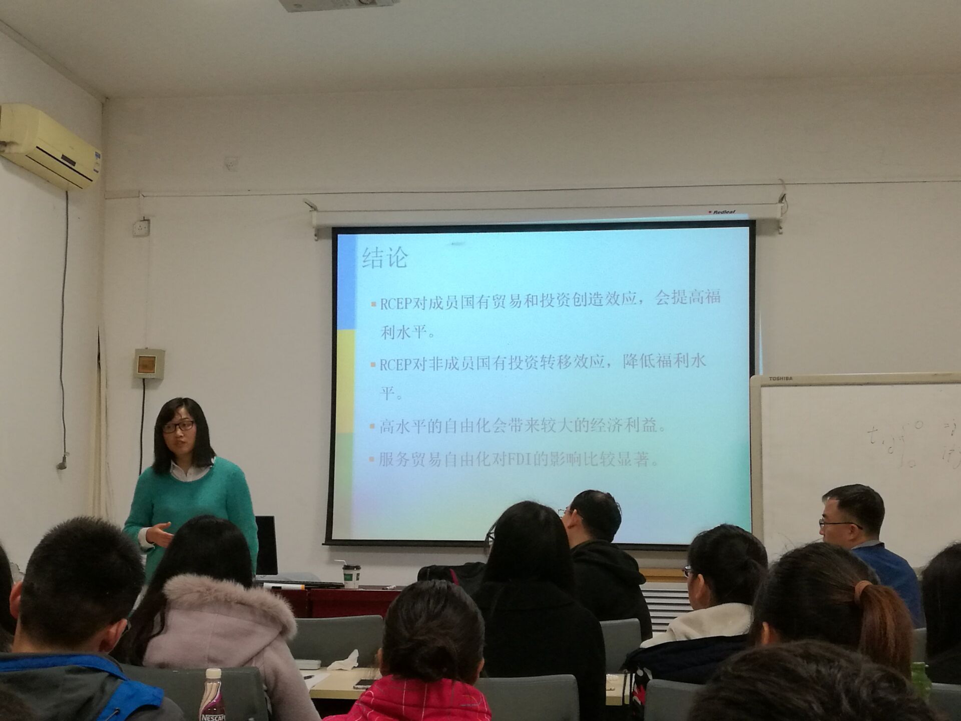 2016年3月23日晚,由经济学系和数理经济与统计系主办的现代经济学理论方法与创新论坛第十一卷第十一期在8202教室顺利举行。此次论坛主题为“Analyzing Effects of RCEP on FDI in a Firm Heterogeneity CGE Framework”,论坛由经济学系主任高煜教授主持,刘瑞明副教授担任评论人,世界经济与贸易系李侨敏博士担任主讲人,yl23455永利官网青年教师、本科生和研究生30余人参加了此次论坛。