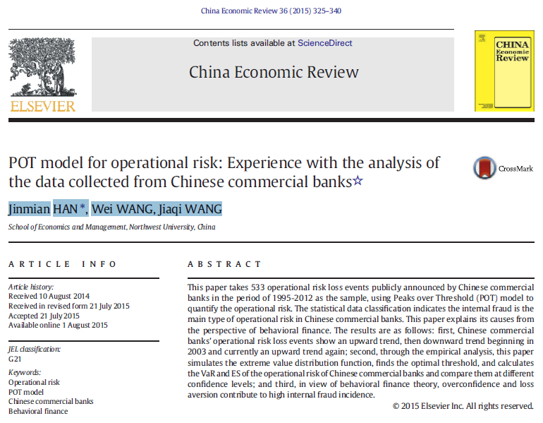 近日,永利官网韩锦绵副教授和其研究生的论文《POT model for operational risk: Experience with the analysis of the data collected from Chinese commercial banks》在SSCI期刊China Economic Review发表。(China Economic Review36 (2015), 325-340)
