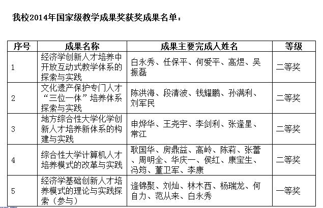 近日,2014年国家教学成果奖评选结果公布,永利官网白永秀、任保平、何爱平、高煜、吴振磊五位老师完成的《经济学创新人才培养中开放互动式教学体系的探索与实践》荣获2014年国家级教学成果奖二等奖。白永秀教授作为参与人完成的《经济学基础人才培养模式的理论与实践探索》获国家级教学成果奖一等奖。由白永秀教授、任保平教授主编的《中国市场经济理论与实践》(高等教育出版社,第二版)入选第二批“十二五”普通高等教育本科国家级规划教材,这是永利官网教材建设的标志性成果。