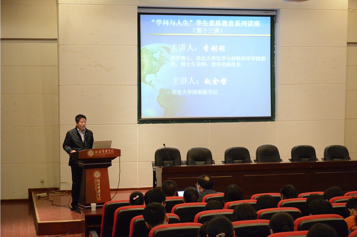 10月22日下午4时,“学问与人生”学生素质教育系列讲座第十三讲在金海恒业报告厅举行,本场讲座特邀我校化材学院教授、教务处副处长李剑利老师和校团委副书记赵金哲老师分别为学生作了题为《点燃创新—大学生创新创业训练计划辅导》和《挑战自我放飞梦想—“挑战杯”课外学术科技作品竞赛辅导》的讲座,讲座由院党委副书记李一凡主持,学院师生共计260余人到场听取讲座。