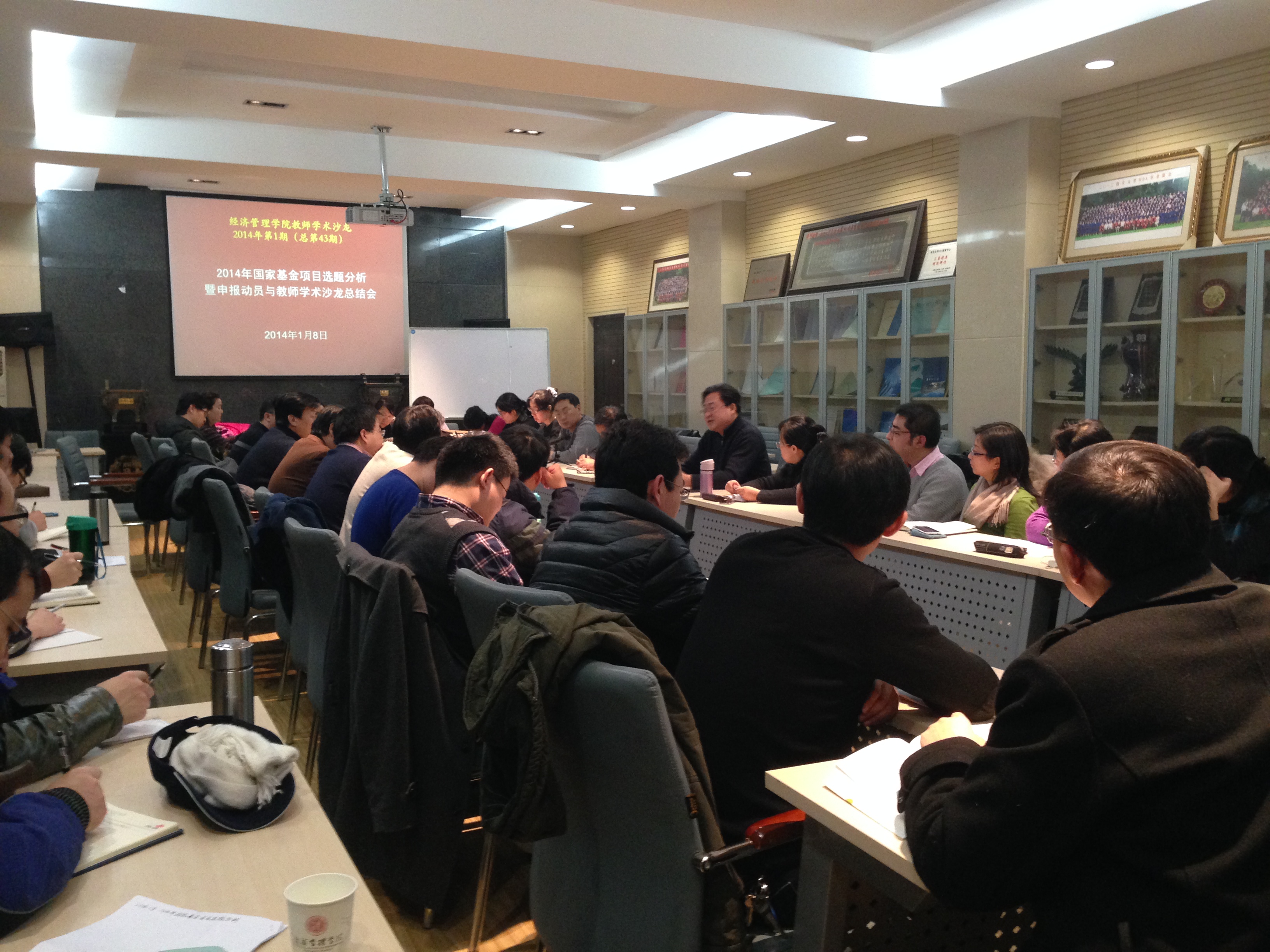 2014年1月8日yl23455永利官网教师学术沙龙2014年第1期在北校区yl23455永利官网311举行。本期学术沙龙的主题是“2014年国家基金项目选题分级——暨项目申报动员与学术沙龙总结会”。yl23455永利官网社科处处长刘丰教授、yl23455永利官网院长任保平教授、何爱平教授、安立仁教授、茹少峰教授、杜勇副院长、吴振磊副院长及学院教师60余人参加了本次学术沙龙活动。