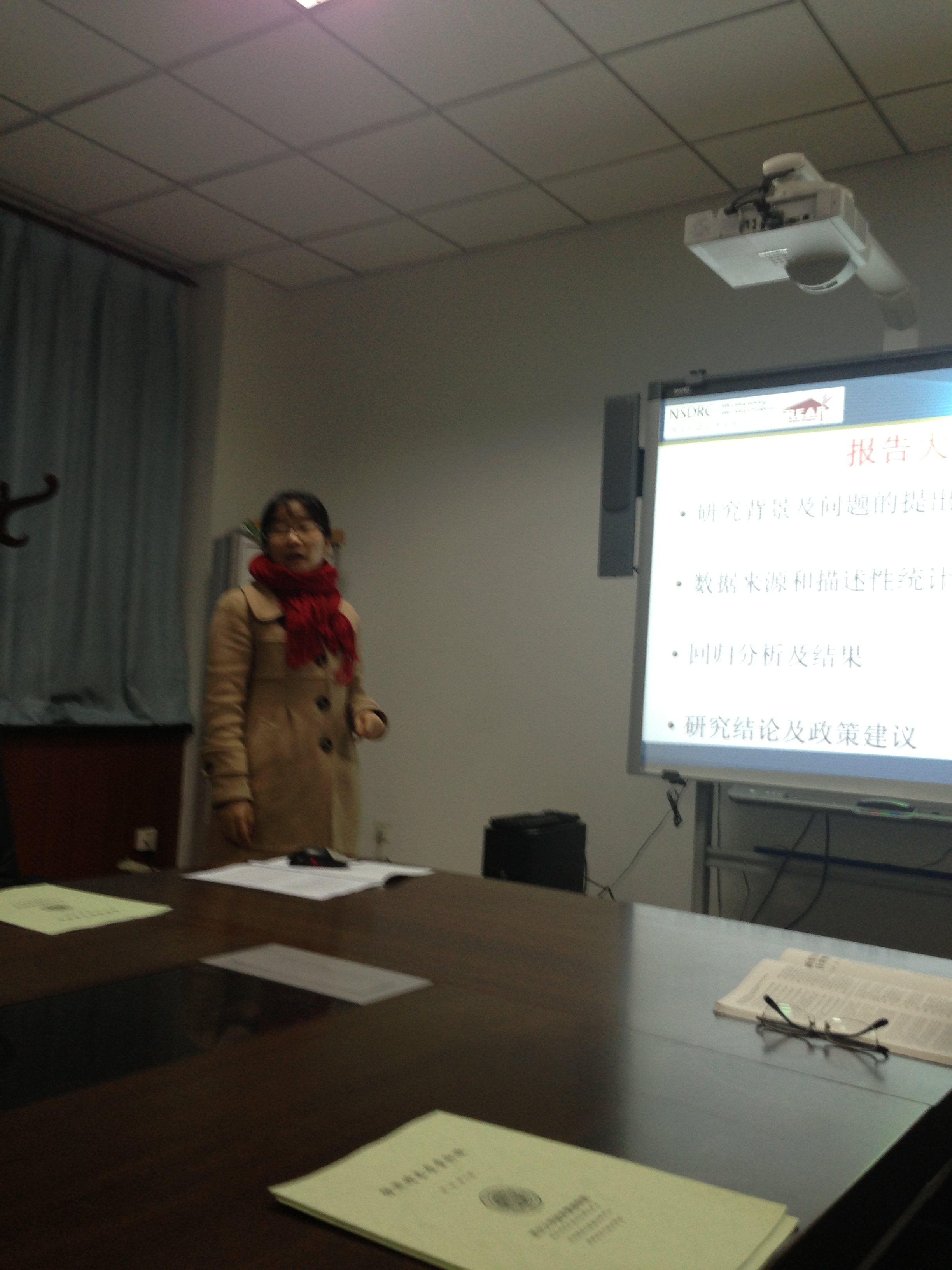 12月26日经济增长质量论坛第10期在长安校区经济增长质量研究中心举行。yl23455永利官网西北社会经济发展研究中心研究助理岳爱博士应邀作题为《新型农村社会养老保险对家庭日常费用支出的影响》的学术报告。yl23455永利官网史耀疆教授、师博副教授、刘燕妮博士、安树军博士以及yl23455永利官网经济增长质量研究团队的博硕士和本科生参加了讨论。