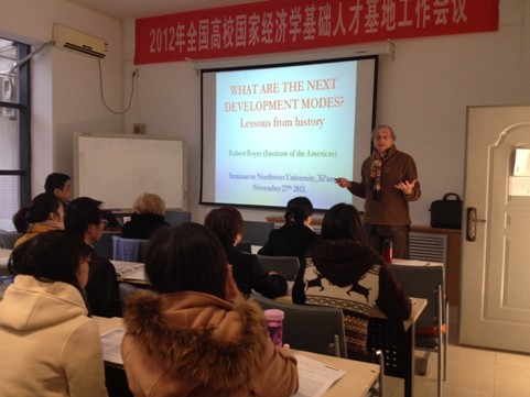 2013年11月27日上午,经管学院邀请国际高端专家短期教学系列讲座在长安校区8202教室举行。法国经济学调节学派代表人物Robert Boyer教授做了题为“增长是否带来繁荣?”(Does growth bring prosperity?)和“未来的发展模式是什么?”(What could be the next development models?)的学术报告。永利官网经济学博士、硕士及部分教师聆听了报告。报告会由经济学系系主任何爱萍教授主持。