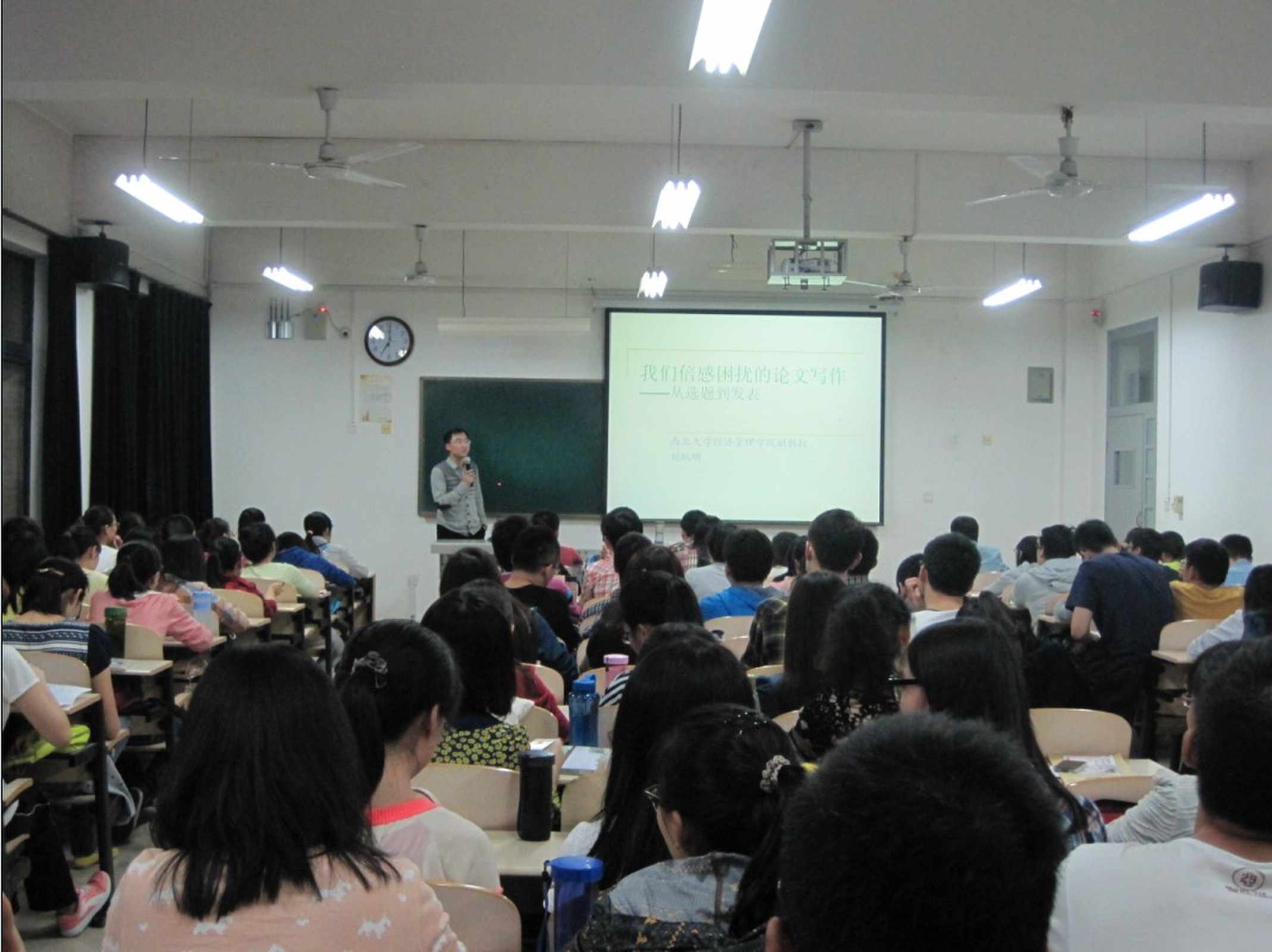 刘老师从自身经历出发讲述了如何进行论文写作以及如何发表论文的问题。整场报告以为什么要写论文这一话题作为切入点,谈及到作为一名硕士研究生,应当对写论文的目的有一个清楚的认识,不应只是为发表论文而发表,而应当有更高层次的追求。接着刘老师给出了两个经典的经济学论文的写作范式,为大家之后论文写作提供了参考。在接下来关于如何选题的问题上,刘老师向同学们提出了选题的三大原则,即重要、有趣和创新,并向同学们强调不能忽视论文的可操作性。之后,刘老师就搜索文献、选择文献以及撰写文献综述方面给了大家很多的指导意见。在建模和计量方面,刘老师讲到了在建模过程中抽象能力的重要性,并且介绍了一些主流的计量方法和计量模型。最后谈了关于论文发表的问题。论文发表首先要对论文本身的细节问题进行反复检查,应避免错别字以及错误的标点等细节性问题,并提醒大家要根据自身能力选择合适的刊物进行发表。