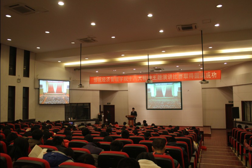 为积极引导广大同学全面准确领会党的十八大精神,在全院学生中兴起学习宣传贯彻十八大精神的热潮。12月12日晚,经管学院在金海恒业报告厅举办了“坚定信念,立志成才”弘扬十八大精神为主题演讲比赛,全院200余名同学观看了比赛。