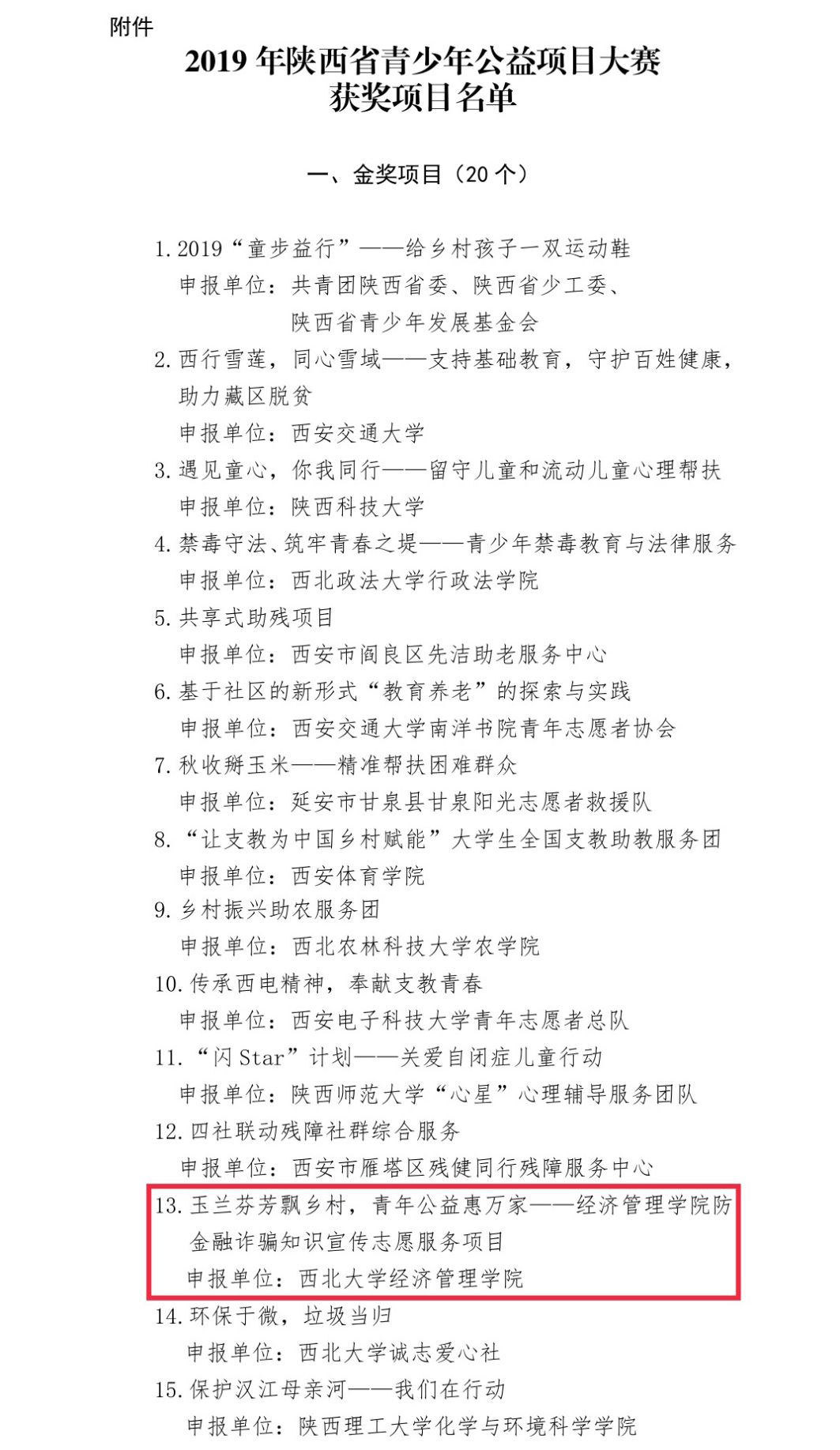 由永利官网团委史歌老师指导,2017级金融工程班安亭樾主持申报的项目《玉兰芬芳飘乡村,青年公益惠万家--yl23455永利官网防金融诈骗知识宣传志愿服务项目》,喜获2019年陕西省青少年公益项...